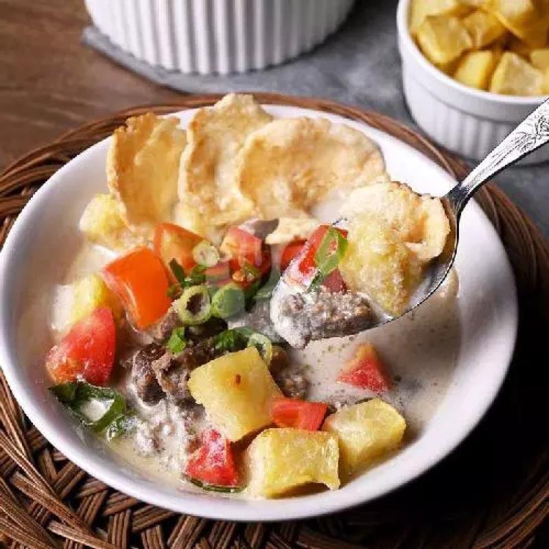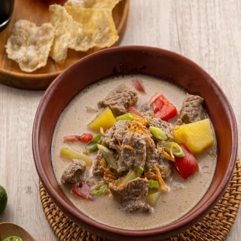 Soto Betawi dengan kuah santan gurih, daging sapi, dan emping.