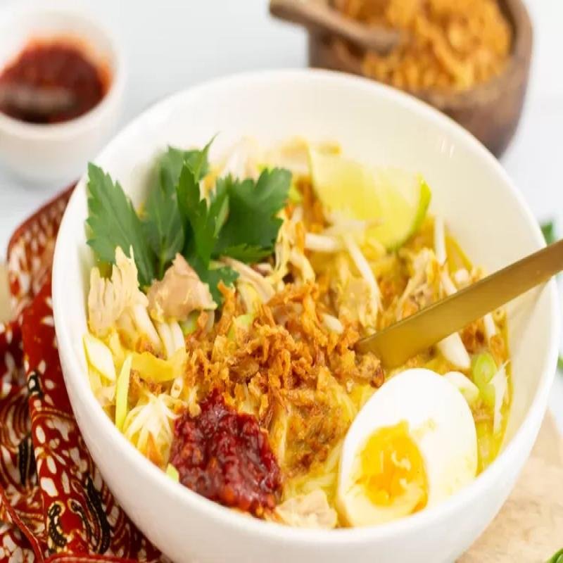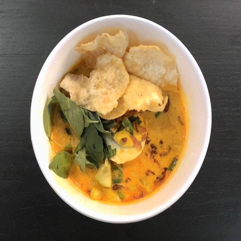 Laksa Betawi dengan kuah santan kental, mie, telur, daging, dan daun kemangi.