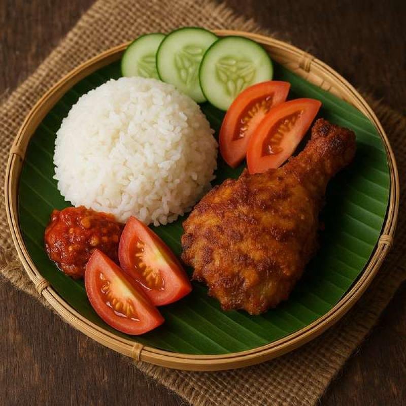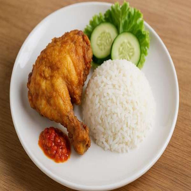 Ayam goreng khas rumah kami gurih dan renyah. Disajikan dengan nasi hangat dan sambal.